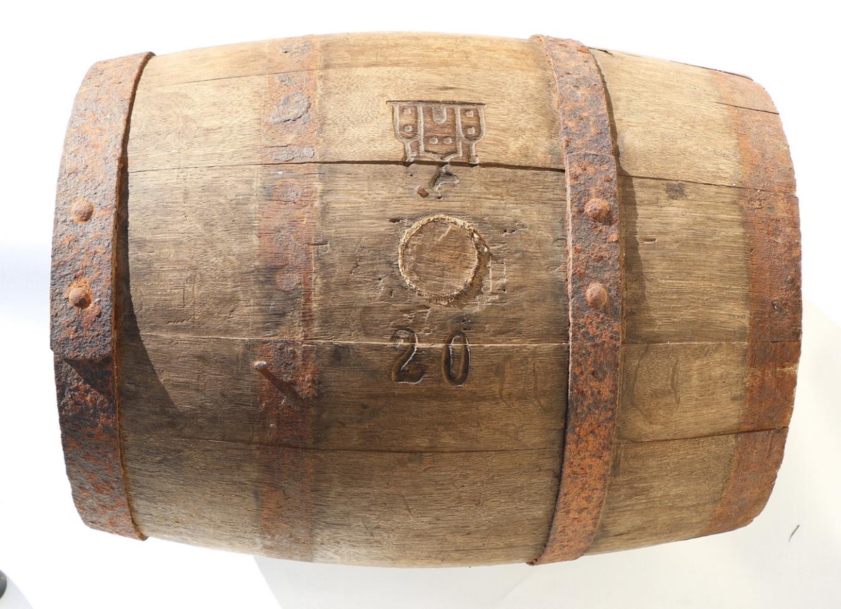 Kvartil úr eik með fjórum járngjörðum. Það er 38,7 cm hátt og um 28 cm að þvermáli við botnana. Stafirnir eru fjórtán, misbreiðir. Gat með korktappa í er á öðrum botninum svo og á bumbunni, en í því eikartappi. Öðrum megin við það er talan 20 innbrennd en hinum megin þrír turnar, sá í miðið hæstur og með hálfmána á turnaspírunni, en hinir með kúlu á hvorri spíru. Dyr og tveir gluggar eru á miðturninum, tveir gluggar eru á miðturninum, tveir gluggar á hvorum hinna (borgarmerki Kaupmannahafnar?). Gjarðirnar eru nú ryðgaðar.