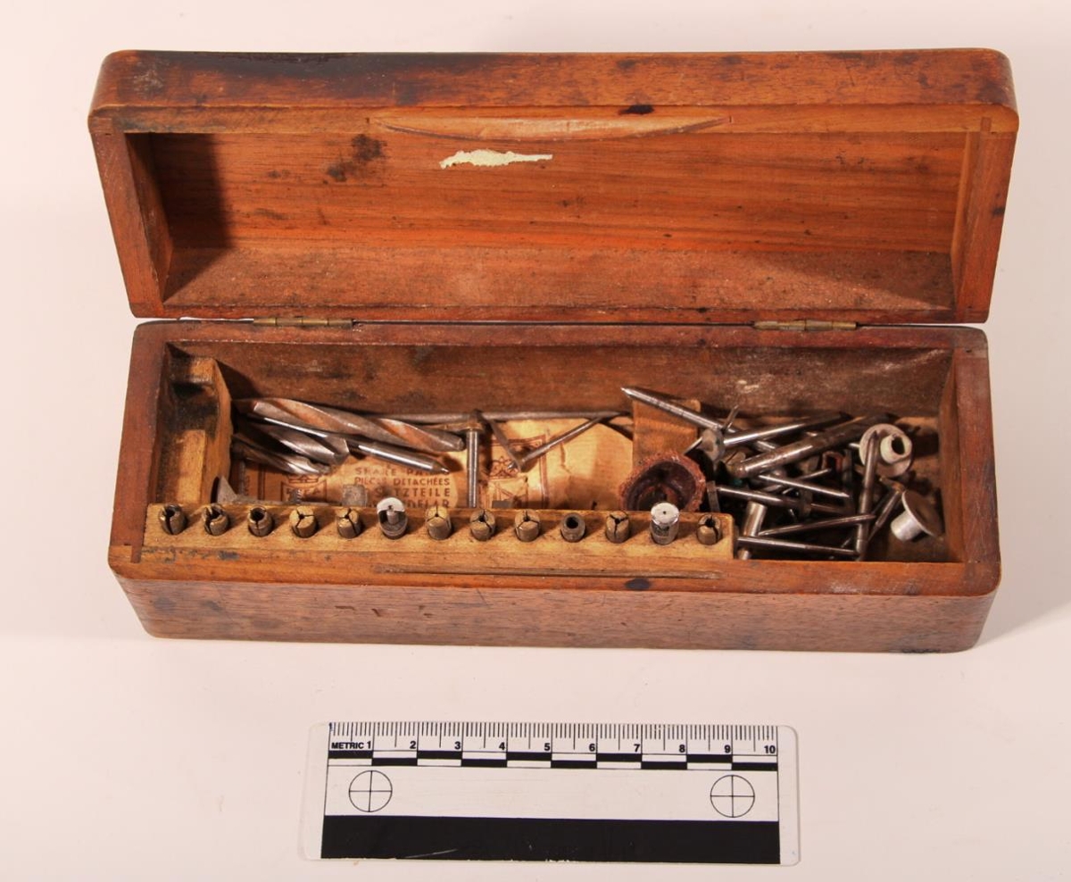 Kassi úr furu. Verkfærakassi. Eitt hólf, með bakka fyrir 13 klær. Ofan í honum eru ýmis smáverkfæri og áhöld sem tengjast úrsmíðum s.s. klær, borar, millimetramál (sagfill), smájárn af vél, gömul næla og tvær tangir ásamt tvíkló.