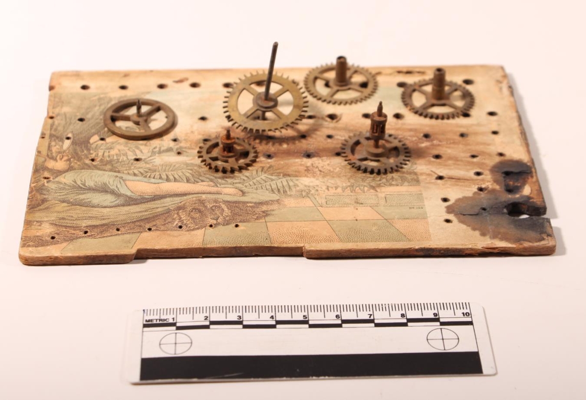 Boramát úr þunnri furufjöl. Lok af vindlakassa. Með mynd. Götin eru misstór. Frá Jörgen Fr. Michelsen, úrsmið á Sauðárkróki. Gefandi er Aage Michelsen frá Sauðárkróki.