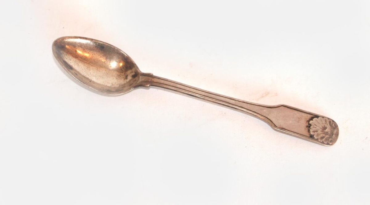 Silfurskeið, teskeið. Fylgir skeið 1997: 900, eins skeljamynstur á enda (en ekkert laufmynstur). Haldið mjókkar í áttina að skálinni og það er útskorið (renndur eftir jaðri). Aftan á skeiðinni stendur 18 SH 50.