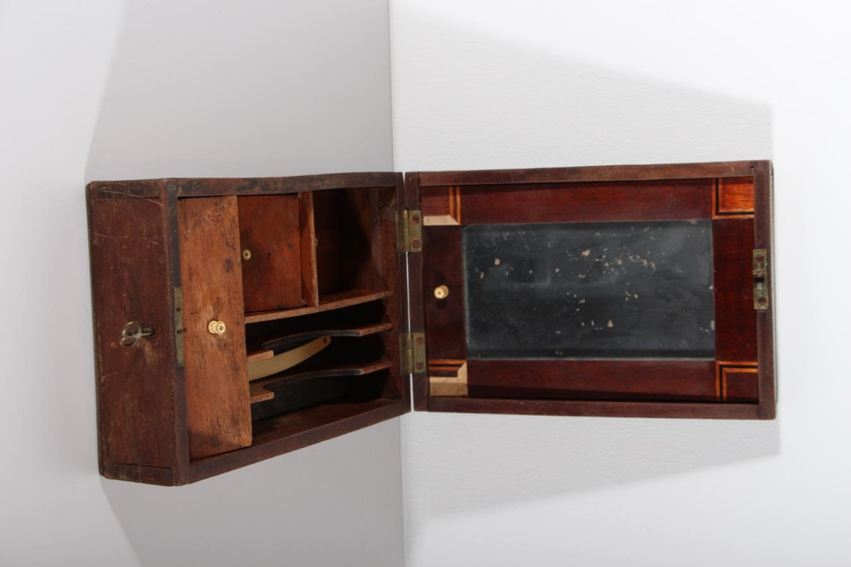 Skeggkassi Sigurðar Péturssonar, bónda á Hofsstöðum. Geirnegldur, brúnn kassi, (viðgerður af A.H.S límdur), lamir og læsing úr kopar. Stærð 24 x 16,5 x 8,5 cm. Í kassanum er innrammaður spegill, festur innan í lokið. Ofan í kassanum eru sex hólf og þrír þeirra eru með lausum lokum með beintöppum. Lítill lykill fylgir.