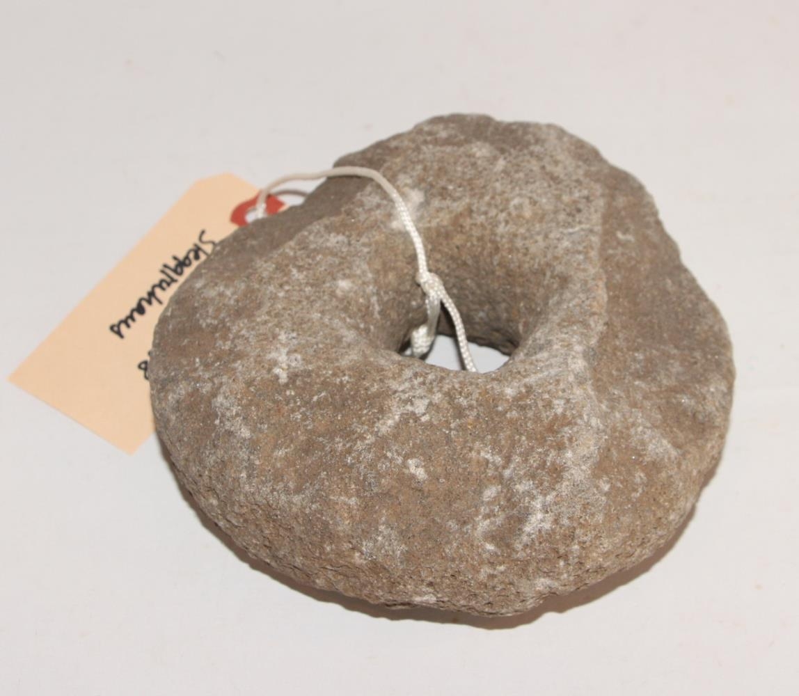 Sleggjuhaus úr grágrýti. Nær hringlaga steinn. Nokkuð sléttur. Steinninn er um 18 cm í þvermál. Gatið er nær kantað 3-5 cm á kant, þrengst í miðjunni. Þykkt steinsins er 5,5 cm.