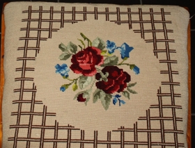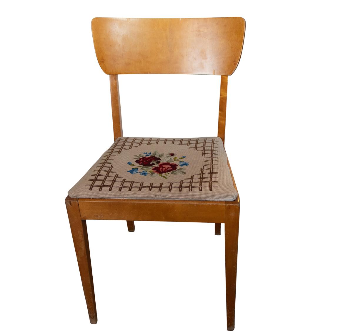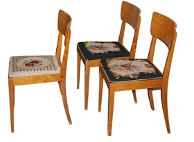 Þrír boðstofustólar úr ljósum við með útsaumuðum sessum. Kemur úr búi Karenar Haug (1908-1982) og Gísla Vilhjálmssonar (1899-1975). Stólarnir eru líklega frá því um 1950 og í góðu ásigkomulagi.