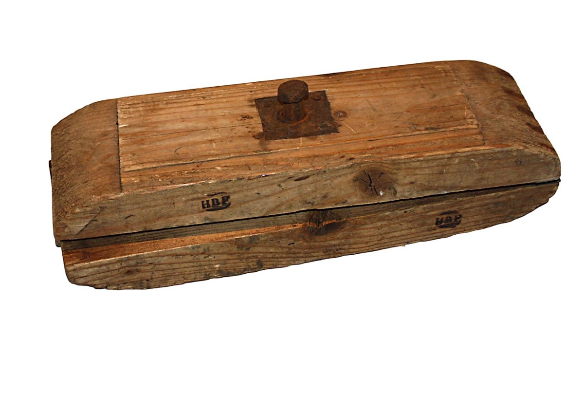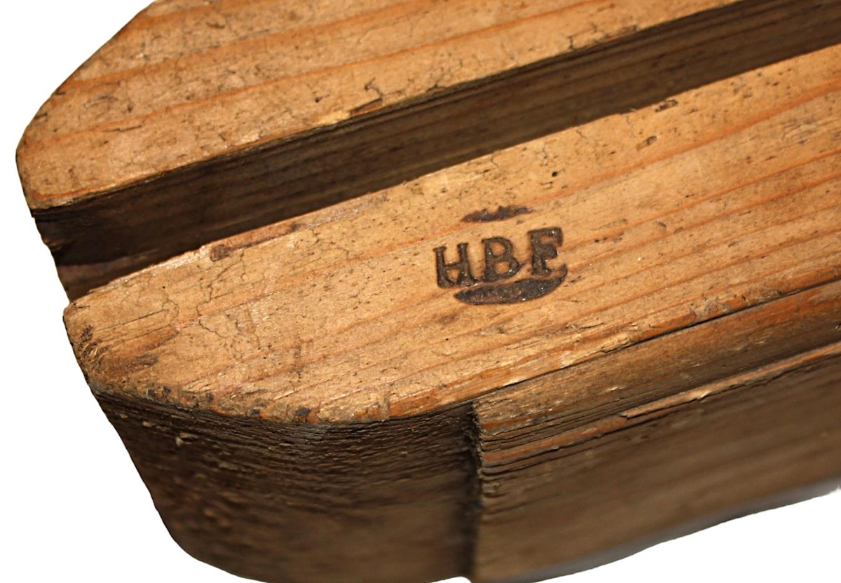 Rúllupylsupressa úr tré og merkt HBF. Gömul.