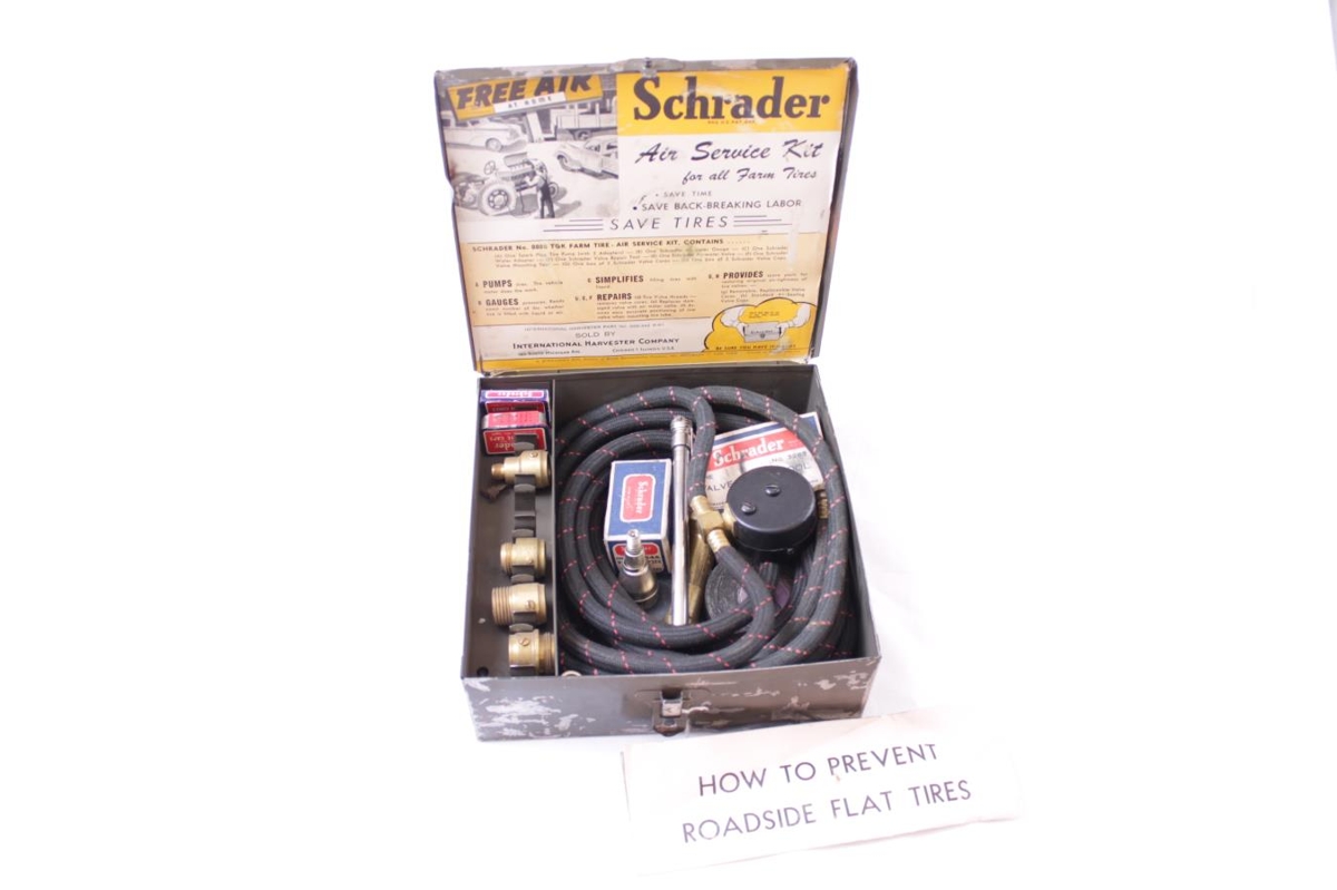 Askja "Tire Valve Cores", 5 ventlar. Askja "Tire Valve Caps", 2 ventlar. 4 stk íhlutir úr látúni. Askja "Water Adapter for Tractor Tires". Loftþrýstingsmælir fyrir dekk. Límbandsrúlla. Slanga með 2 stútum úr látúni, þrýstingsmælir í miðjunni. 4 aðrir smáhlutir úr stáli. Bæklingur "How to prevent roadside flat tires".
