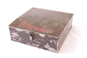 Verkfærasett til dekkjaviðgerða. Gerð: Schräder. Málmkassi, lakkaður svartur. Rauðir upphleyptir stafir á loki: "Schrader".