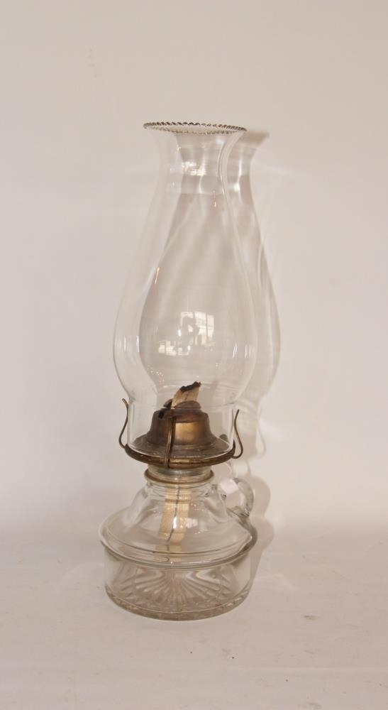 Olíulampi úr gleri, bæði tankur og glas en brennarinn er úr pjátri (blikki) og kveikurinn úr bómull. Tankurinn er um 10 cm í þvermál og 10 cm hár. Þvermál glass, neðst er um 7 cm. Eyra er á tanknum. Lampinn er í fullkomnu lagi.