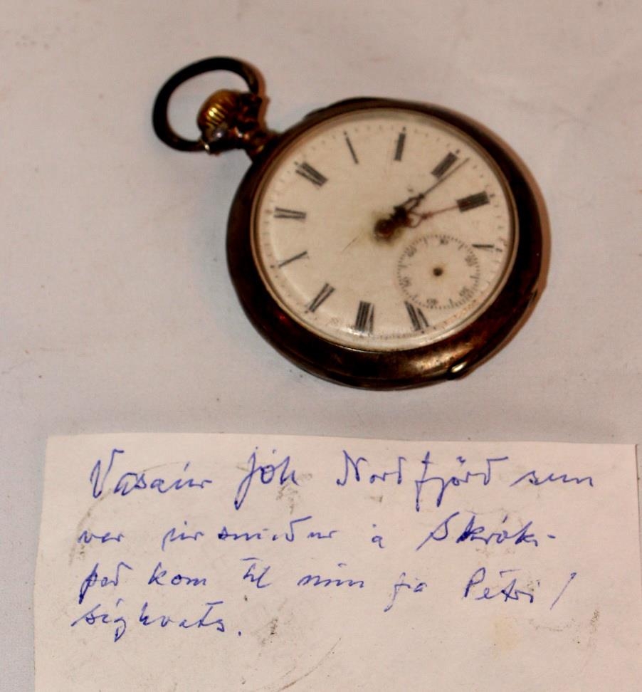 Vasaúr 4,6 cm í þvermál , 1,3 cm breitt úr silfri en er mjög á það fallið. Glerið er talsvert rispað og máð. Sekúnduvísinn vantar. Hægt er að opna bæði fram- og afturhlið úrsins, en að aftan vantar plötuna í lokið en spöngin er enn á sínum stað. Á bakhliðina er grafið „Jóhannes Norðfjörð Sauðárkrók”. Við hliðina á trekkjaranum er hnappur sem haldið er inni þegar stilla á úrið.