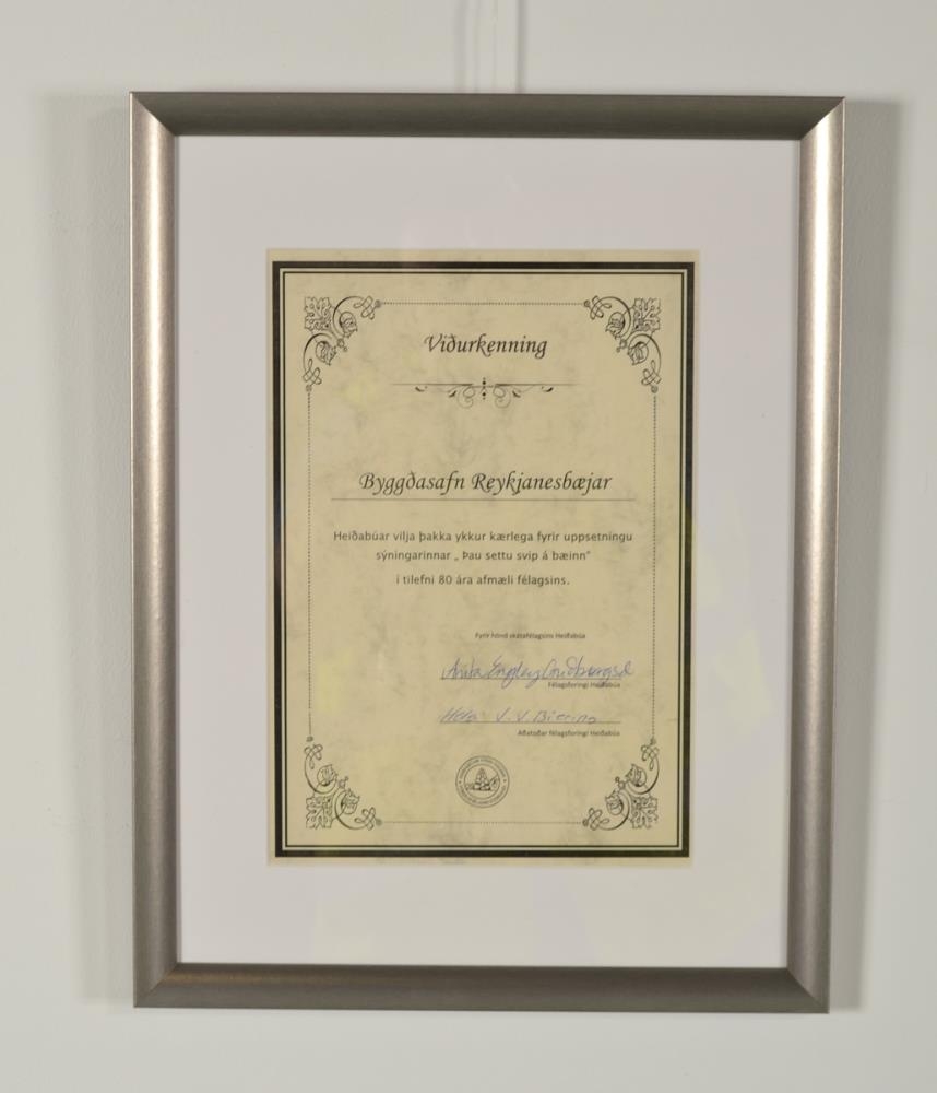 Innrammað viðurkenningarskjal frá Heiðarbúum. Texti „Viðurkenning. Byggðasafn Reykjanesbæjar. Heiðarbúar vilja þakka ykkur kærlega fyrir uppsetningu sýningarinnar „Þau settu svip á bæinn“ í tilefni 80 ára afmælis félagsins. Fyrir hönd skátafélagsins Heiðarbúa Aníta Eyberg Guðbergsdóttir, félagsforningi Heiðarbúa. Helgi V.V. Biering, aðstoðar félagsforingi Heiðarbúa“ Ramminn er silfurlitur viðarrammi.