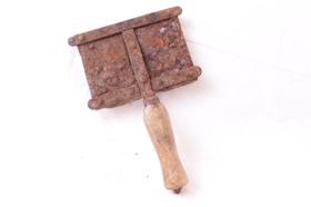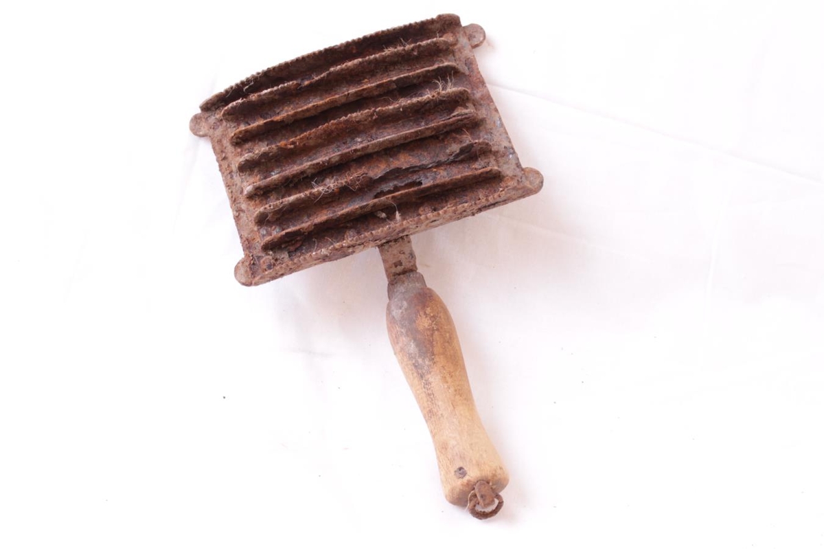 Hrossakambur úr járni með viðarhandfangi. Kambur mjög ryðbrunninn.