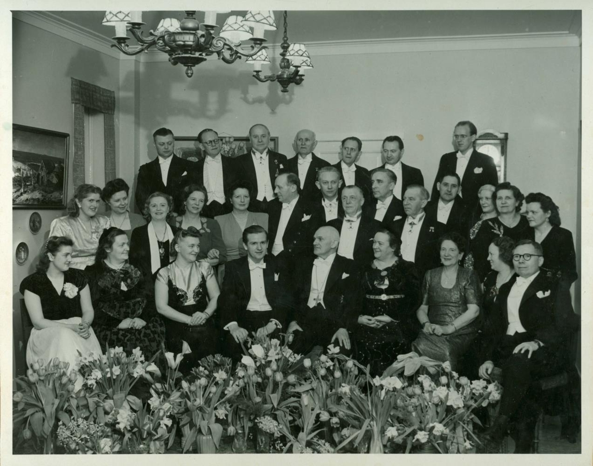 Hópur spariklæddra karla og kvenna í stofu. Fremst og í heiðursstöðu er Pétur Sigurgeirsson prestur og síðar biskup. Fjöldi presta og guðfræðinga í hópnum. Gæti tengst prestvígslu Péturs eða próflokum í guðfræði.