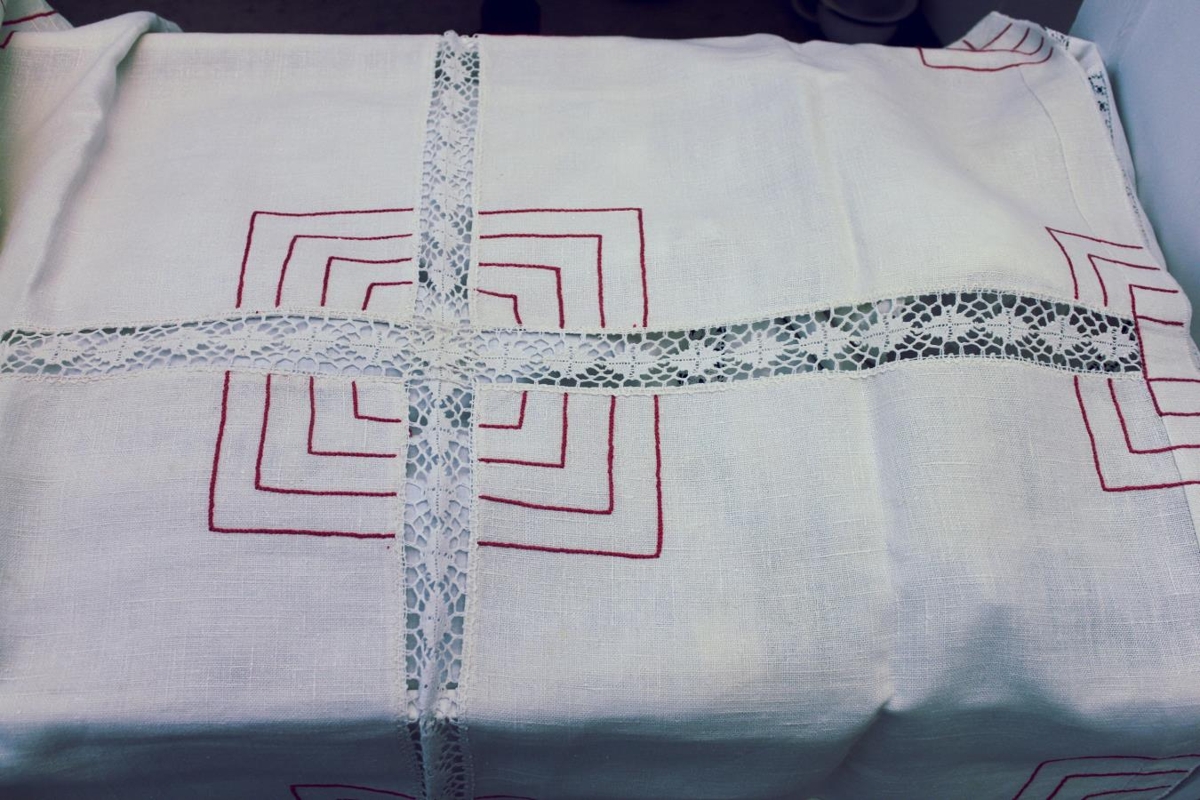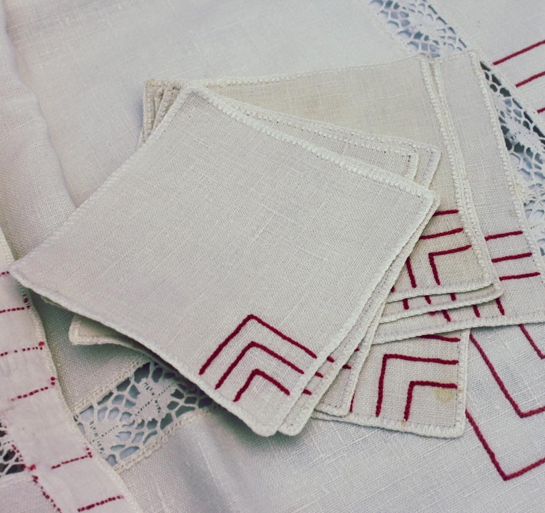 Lítill kaffidúkur ásamt 8 litlum servíettum 16x16 að stærð. Dúkurinn er unninn úr sykurpokaefni – líkist hörefni. Efnisbútarnir eru samsettir með blúndu í kross fyrir miðju og saumað út með rauðum kontórsting fjórar raðir í ferning í miðju dúksins. Á sama hátt er saumað í hvert horn og einnig við faldbrún fyrir miðju dúksins. Kappmellað yst á faldbrúninni. Í einu horni servíettanna er einnig saumaðar þrjár randir með rauðum kontórsting og kappmellað að utan.
