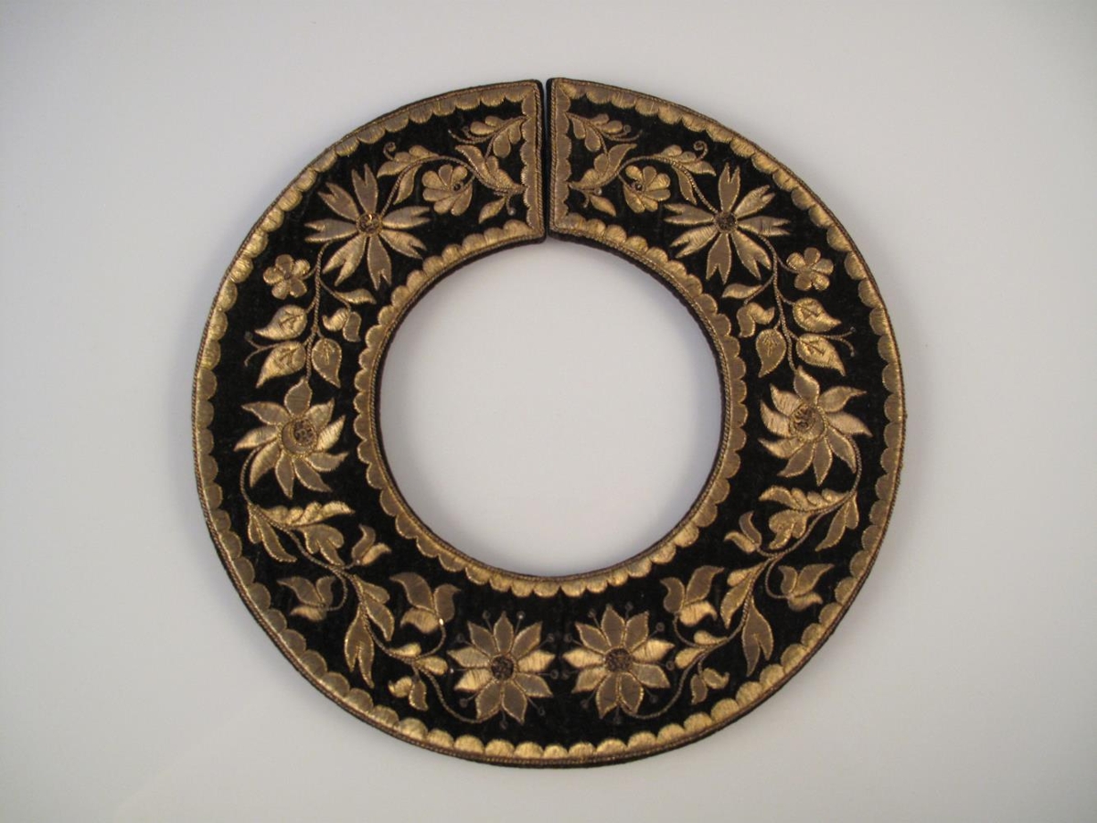 Skautkragi, klæddur svörtu flaueli bæði að ofan- og neðanverðu. Kraginn er áberandi mikið skreyttur og íburðarmikill. Baldýraður með gylltum þræði. Á nokkrum stöðum má sjá litlar, gylltar pallíettur á blómunum. Munstur allan hringinn (litlar tungur). Kraginn er úr eigu Kristínar Pálsdóttur Vídalín Jacobsen (f. 1864, d. 1943). Foreldrar gefanda, Kristinn Ingi Hansen (f. 1943, d. 2003) og Joyce Darling Hansen (f. 1946), fengu á sínum tíma Elsu E. Guðjónsson til að greina kragann og taldi hún að hann væri frá því í kringum 1850. Kraginn var hluti af brúðarbúningi Kristínar er hún gekk að eiga Jón Jacobsen 1895 og gæti hann því komið frá því ári. Kristín Hansen afhenti kragann fyrir hönd fjölskyldu sinnar. Ein krækja er á bakhlið kragans. Á hana hefur nokkuð fallið.