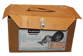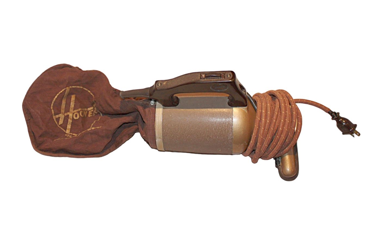Ryksygan HOOVER model 100 brún að lit. Á henni er hangfang úr plasti. Við afturhluta ryksugunnar er festur taupoki sem rykið safnaðist í og hann er hægt að losa frá. Framleiðandi og merking á ryksugu er: HOOVER REG. TRADE MARKS Dustette.