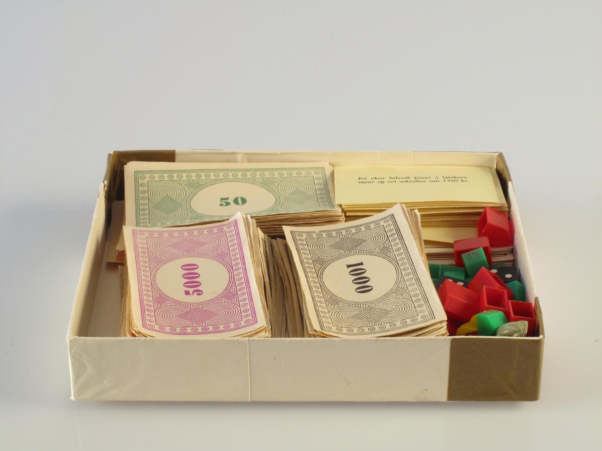 Spilapeningar eru: þrjátíu 10 kr seðlar, fimmtíu 50 kr seðlar, þrjátíu og átta 100 kr seðlar, þrjátíu 500 kr seðlar, sjötíu og sex 1000 kr seðlar og tíu 5000 kr seðlar.