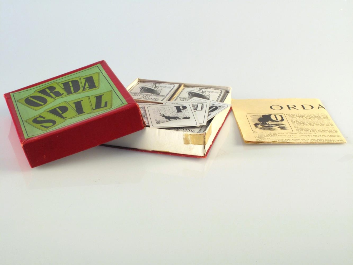 Spil, Orðaspil. Það er í vínrauðum kassa með grænum miða á lokinu með heiti spilsins.