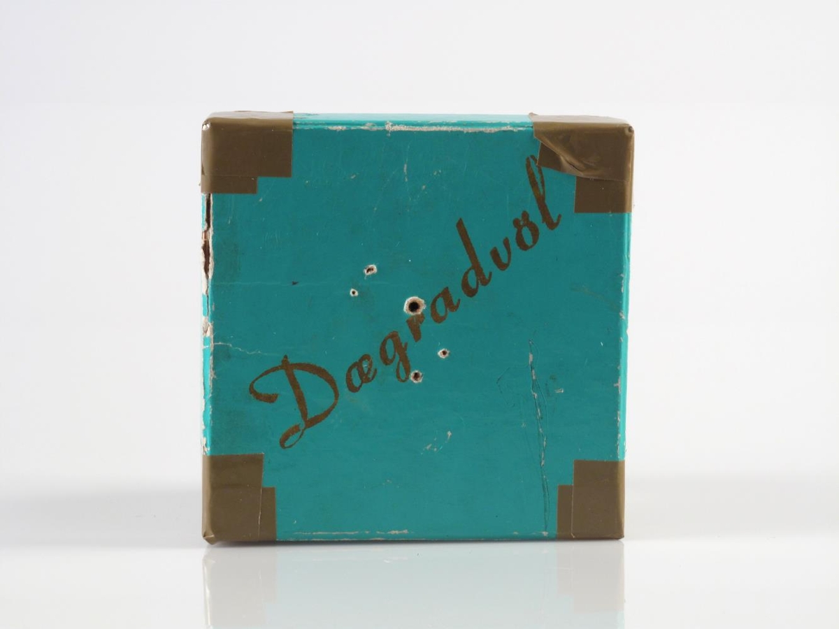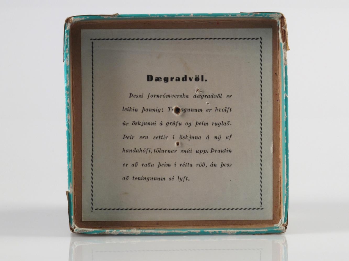 Spil, samsett af 15 teningum: Dægradvöl. Spilið er í grænum kassa og stendur nafn spilsins á ská yfir lokið með gylltum stöfum. Inni í lokinu er lítill miði með leiðbeiningum. Á honum stendur: „Dægradvöl. Þessi fornrómverska dægradvöl er leikin þannig: Teningunum er hvolft úr öskjunni á grúfu og þeim ruglað. Þeir eru settir í öskjuna á ný af handahófi, tölurnar snúi upp. Þrautin er að raða þeim í rétta röð, án þess að teningunum sé lyft.“