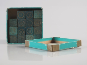 Ofan í kasssanum eru 15 grænir viðarkubbar, allir númeraðir, frá 1 og upp í 15. Á botni kassans stendur tvisvar sinnum „Vibba“, gæti hafa verið eigandi spilsins á einhverjum tímapunkti.