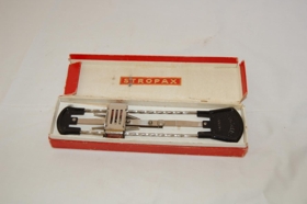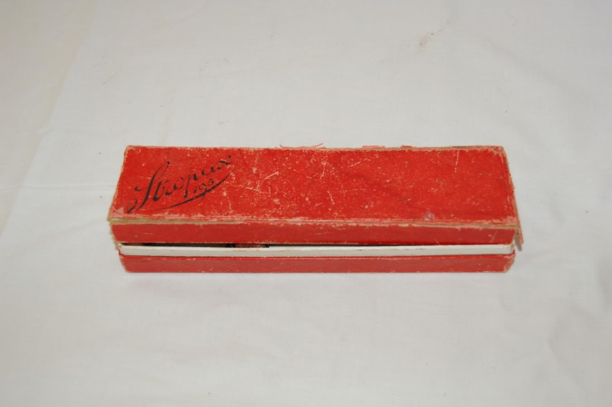 Kassi með brýni til að brýna rakhnífa (skegg). Úr eigu breskra veiðimanna sem stunduðu veiðar í Grímsá á árunum 1900-1980. Á kassanum er áletrunin "stropax.