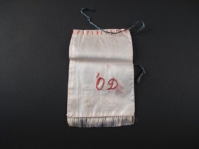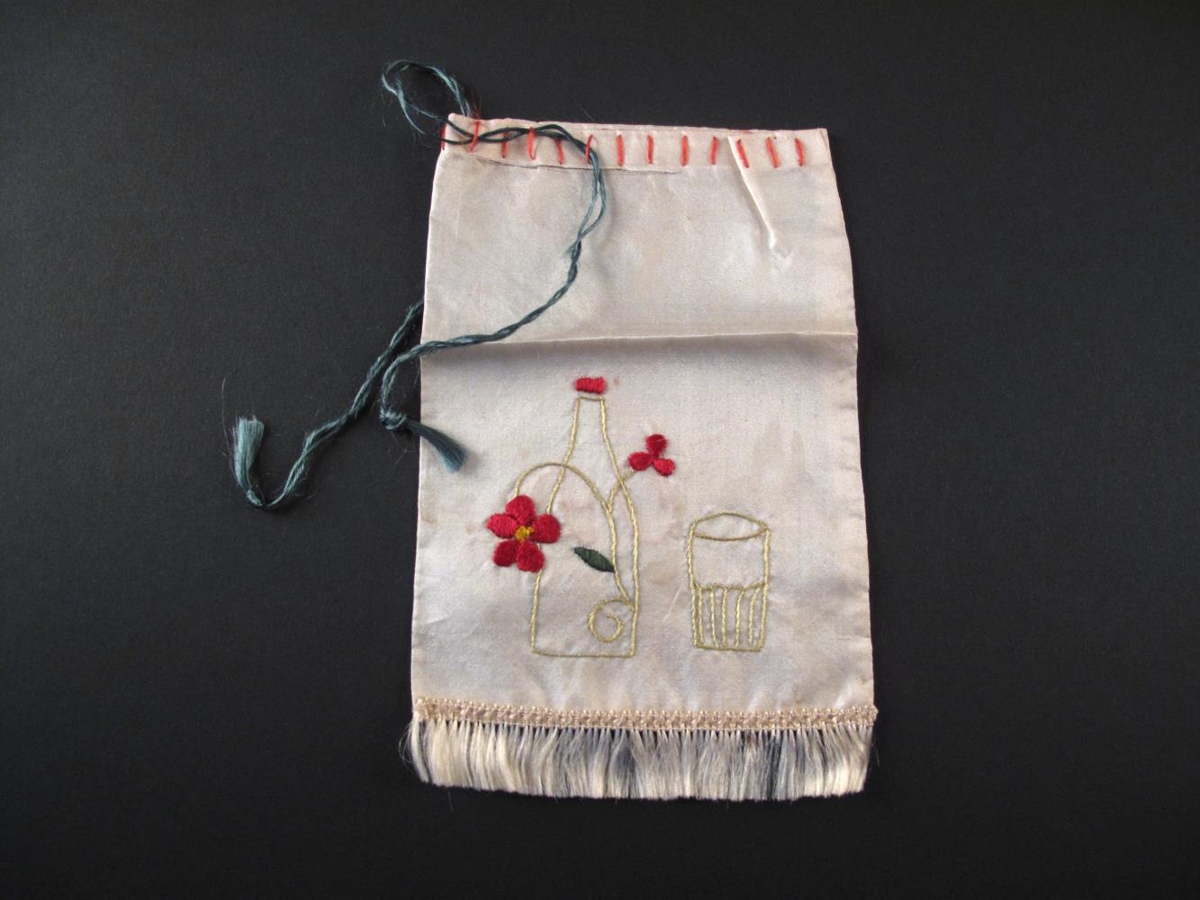 Öskupoki, vélsaumaður úr hvítu silki. Faldaður efst. Á framhlið pokans er handsaumuð mynd af fölgrænni flösku með rauðum tappa og glasi við hlið hennar (hugsanlega mjólkurglasi). Á flöskunni er blómaskraut: tvö rauð blóm á stilkum og eitt grænt laufblað. Í bakhlið pokans er handsaumað, með rauðum þræði, fangamarkið „ÓD“ (þ.e. fangamark þess er átti, Ólafs Daníelssonar). Neðst á pokanum er hvítt kögur, handsaumað á pokann. Faldurinn við opið efst er festur niður með rauðum þræði og dökk-grænblárri snúru, til að rykkja opinu saman, er þrætt undir þessi rauðu spor.
