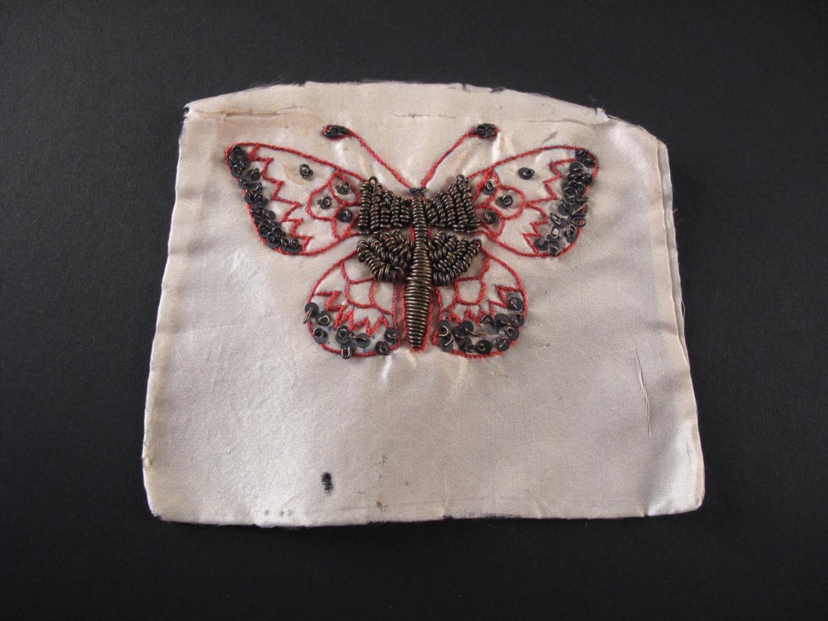Öskupoki, vélasaumaður úr hvítu silki. Faldaður efst við op. Í aðra hlið hans er handsaumuð mynd af fiðrildi. Útlínur þess eru saumaðar með rauðum þræði. Vængirnir eru skreyttir dökkum pallíettum og búkur fiðrildisins er mótaður með snúnum, koparlitum vír (gormþræði?), sem og endar fálmara. Opi pokans er rykkt saman með grönnum málmþræði, koparlitum, sem þræddur er í faldinn með einföldum sporum. Pokinn hefur lengi legið samanbrotinn og silkið hefur trosnað sundur í brotinu. Þá hefur silkið jafnframt trosnað í botni pokans.