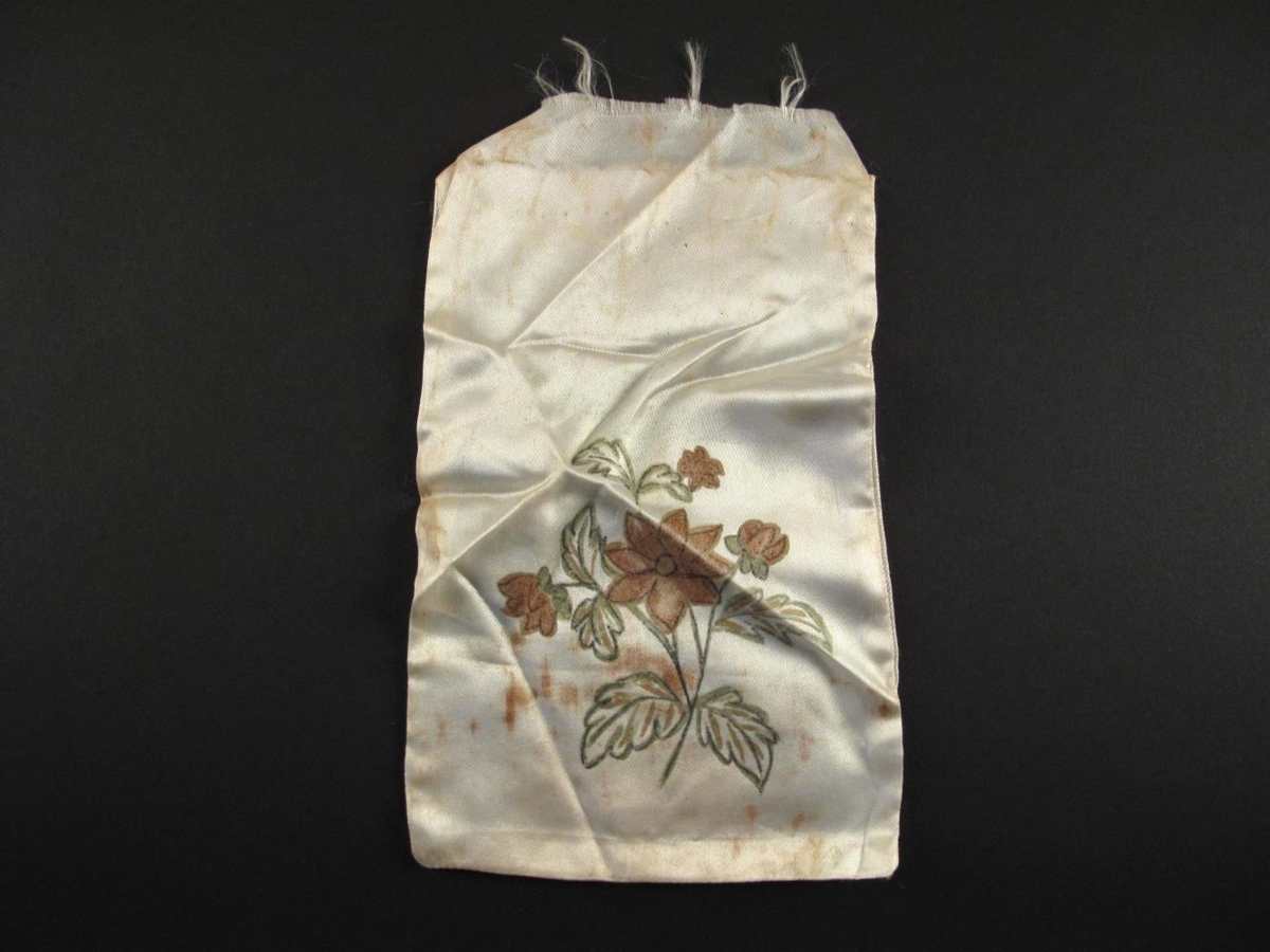 Öskupoki, vélasaumaður úr rauðu silki- eða satínefni. Á annarri hlið hans er handmáluð blómamynd: græn laufblöð og koparlituð blóm (hugsanlega hefur verið glimmer í málningunni). Blómin eru 4 og er eitt þeirra sýnu stærst. Efst við opið hefur pokinn verið faldaður með einföldum sporum er sá saumur hefur nú raknað upp. Öskupokinn hefur gulnað aðeins og nokkuð er af blettum í efninu.