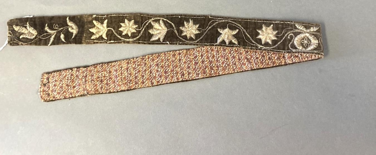 Kvenbelti úr brúnu flaueli með brún mynstruðu bómullarfóðri. Flauel er upplitað. Mynstur saumað með silfurþræði. Bæði fimmblaða og áttblaða rósir. Hefur verið stækkað síðar þar sem er saumað í m. silfurþræði þríblaða blóm. Baldýrað af Guðríði Pálsdóttur prestsfrú í Ásum. Gefið af Þorgerði Jónsdóttur frá Hemru, var fermingarbelti hennar. L. 60 cm Br. 4 cm.