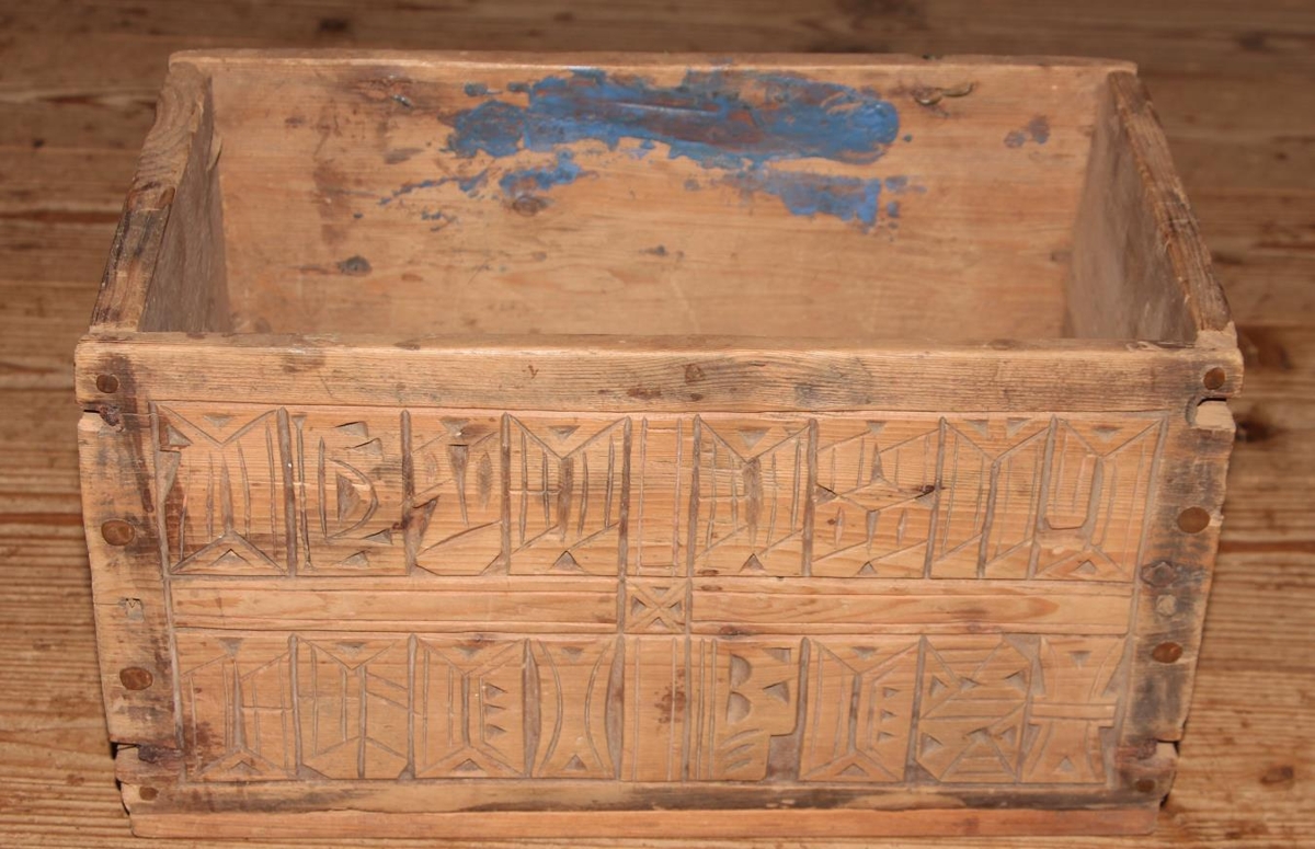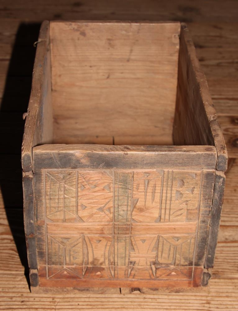 Kistill úr furu, loklaus, 18 x 30,5 cm og 16,9 - 17,2 cm að hæð. Ytri brún hliðafjalanna nær lengra út en innri brúnin. Á hliðar og gafla er skorið með stórgerðu höfðaletursafbrigði.