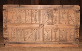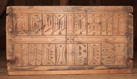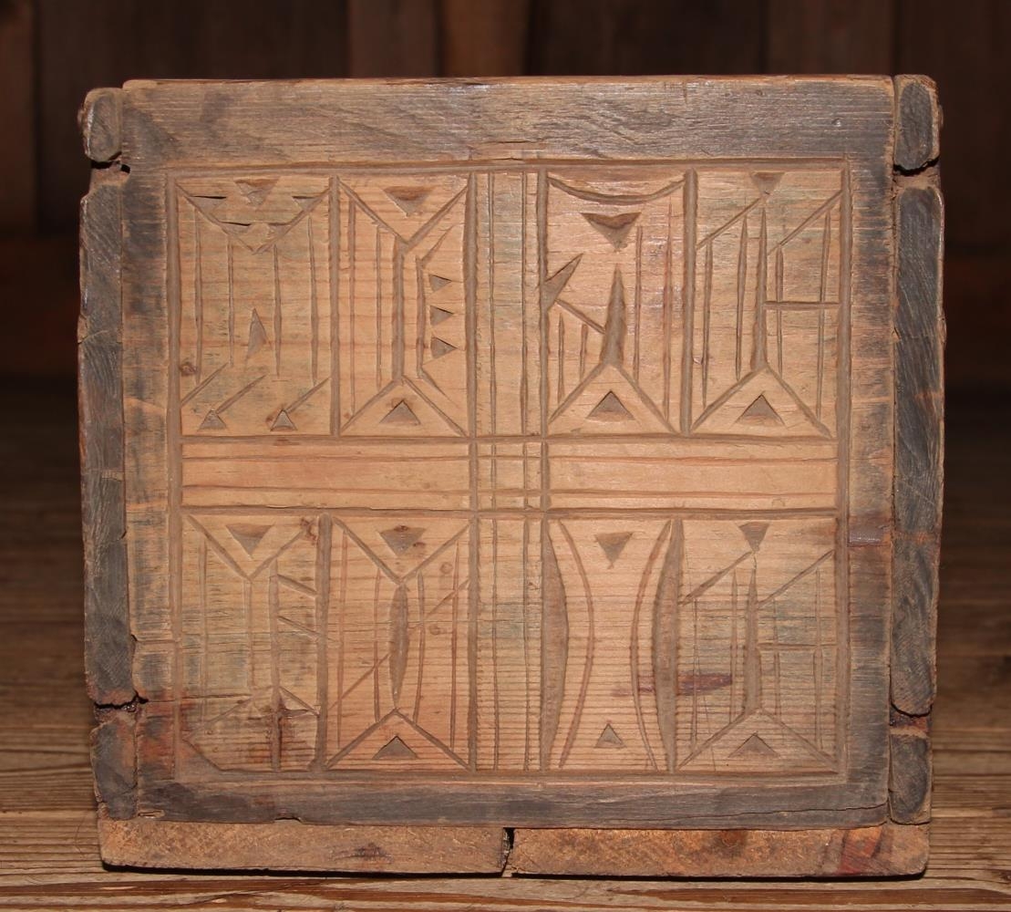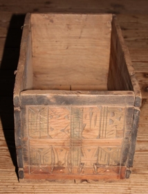 Er stafagerðin eins og á prjónastokknum nr. 61. Til safnsins komu einungir gaflar og hliðar, vantaði þó part í vinstri gafl, en er nú sett saman og viðgert af Pétri Jónassyni, Sauðárkróki.