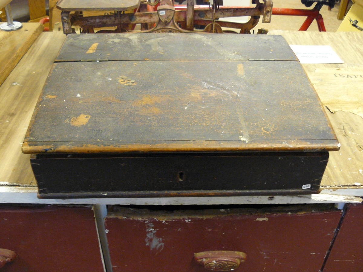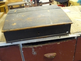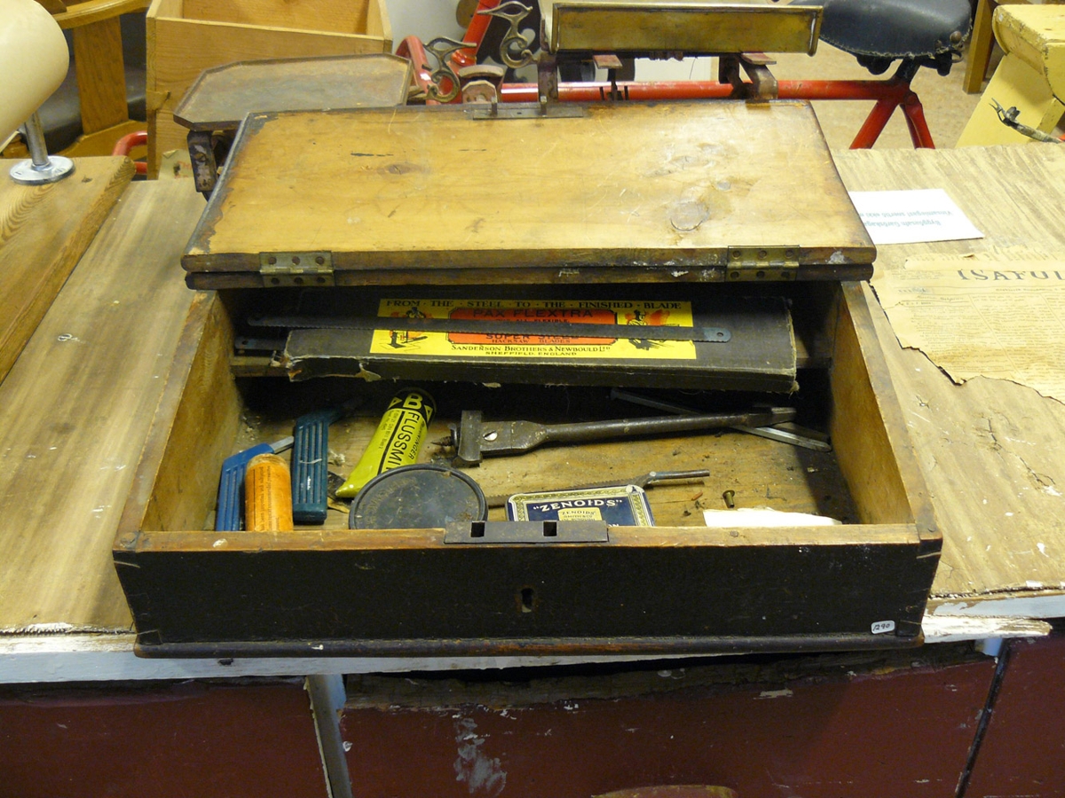 Trékassi, verkfærakassi með púltlagi. Í kassanum eru ýmis áhöld, hægt er að læsa kassanum. Þessi munur kom úr dánarbúi Þorsteins Einarssonar skipsstjóra frá Nýjabæ í Garði (1926 - 1992). Gefandi: Eiginkona Þorsteins, Dagmar Árnadóttir (1924 - 2017).