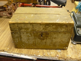 Trékassi, í kassanum er fiskilína og lúðukrókar. Þessi munur kom úr dánarbúi Þorsteins Einarssonar skipsstjóra frá Nýjabæ í Garði (1926 - 1992). Gefandi: Eiginkona Þorsteins, Dagmar Árnadóttir (1924 - 2017).