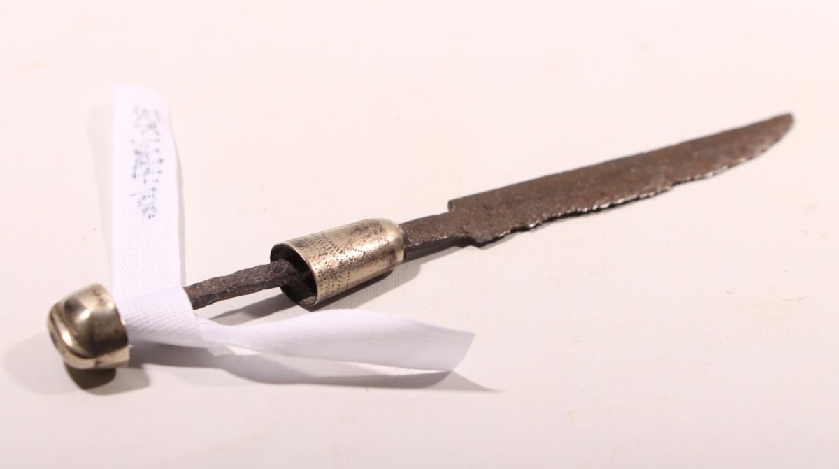 Skeiðarhnífur, lengd 13,2 cm. Tangi og blað eru úr járni, haldið er farið nema hjöltu og endahlíf sem eru úr silfri.