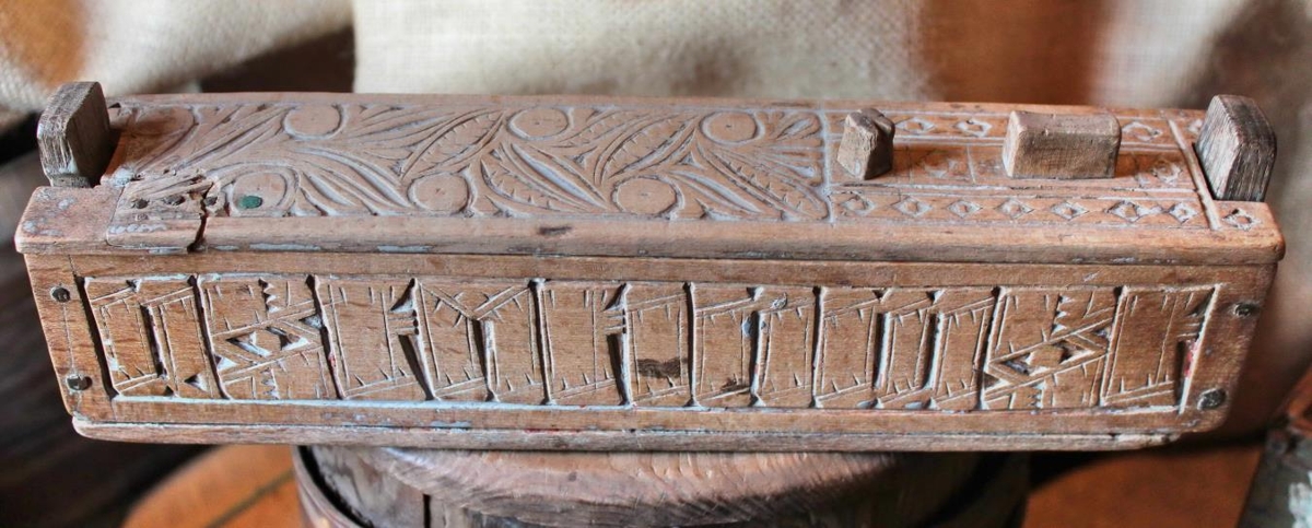 Ofan á lokið eru skorin laufblöð, smákringlur og tíglabekkir, og á gafla tíglaskraut.