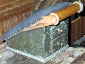 Framan á skríninu er lítil skúffa og yfir skúffunni annað lok og þar fyrir innan lítið geymsluhólf. Fram úr skríninu að ofan ganga tveir klampar og er á milli þeirra sívöl rúlla með tannhjóli á úr látúni og stoppara úr eirvír, og getur rúllan einungis snúist á annan veginn. Í rúlluna er sporaður tígull og hringur boraður ofan í.