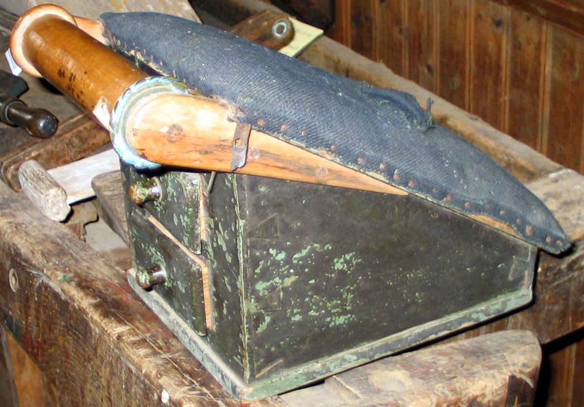 Skrínið er málað dökkgrænt, en sér sums staðar í ljósgræna málningu undir. Rúlla og klampar eru ómáluð. Áklæðið er gatslitið og leðurrönd, sem hefur verið negld umhverfis, er að mestu af nú.