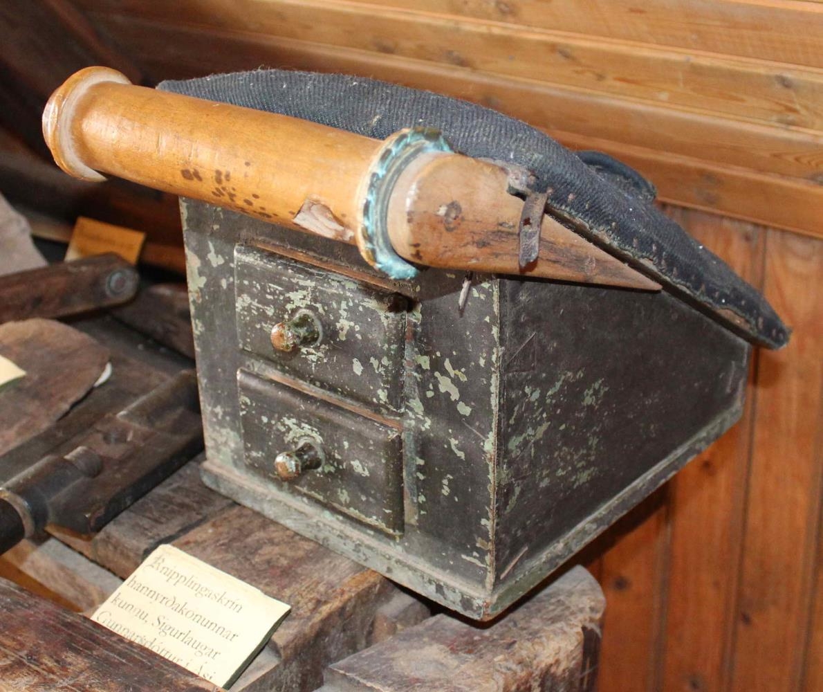 Knipplingaskrín úr furu. Það er nokkurs konar kassi, ferstrendur, hallandi að ofan, að öðrum gaflinum og er þar klætt dökkbláu vaðmáli og er stoppað með ull undir. Kassinn er 19,3 x 24 cm og hæð hans að framan 21 cm en að aftan 5 cm. Botn og lok stendur hvort tveggja út fyrir hliðar og gafla.