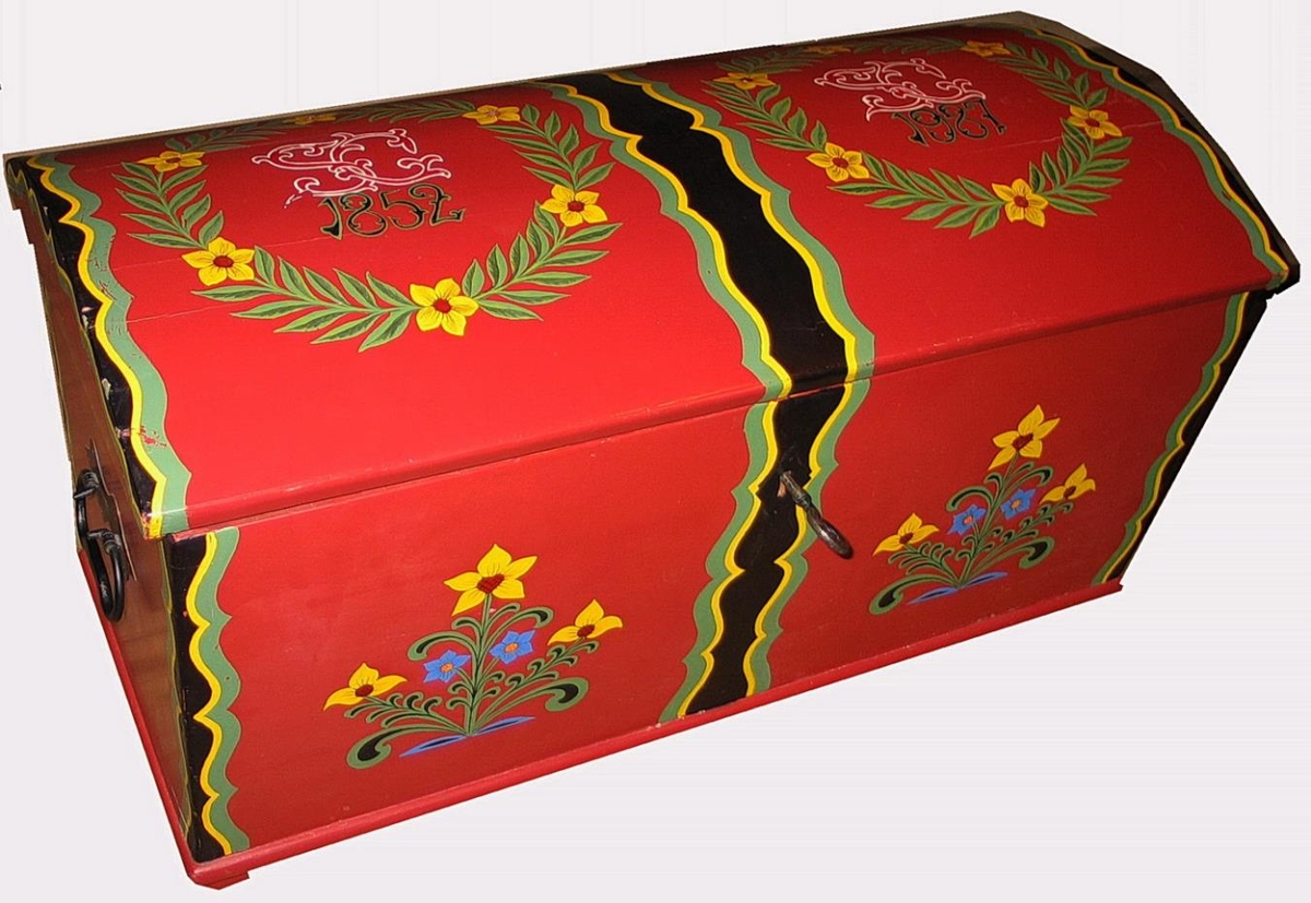 Ekki er vitað hver málaði kistuna 1987 en Sigurlaug Guðmundsdóttir, sem gefur hana til safnsins til minningar um langömmu sína, sagði hana næstum alveg eins og hún var þegar hún fékk hana. Lykill og eyrun eru endursmíðuð, fínir gripir og lásinn er í góðu lagi. Í kistunni er handraði, vinstra megin. Hann er með loki.