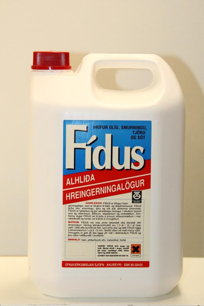 Hvítur plastbrúsi með haldi og rauðum tappa. Áletrun á álímdum miða, hvítum í grunn með rauðum og bláum lit: Fídus - Alhliða hreingerningarlögur - Þrífur olíu, smurningu, tjöru og sót - Eiginleikar, notkunarreglur, innihald og varúðarorð vegna meðhöndlunar (ertandi) - Öflugur hreingerningarlögur, tilvalinn í báta og skip.