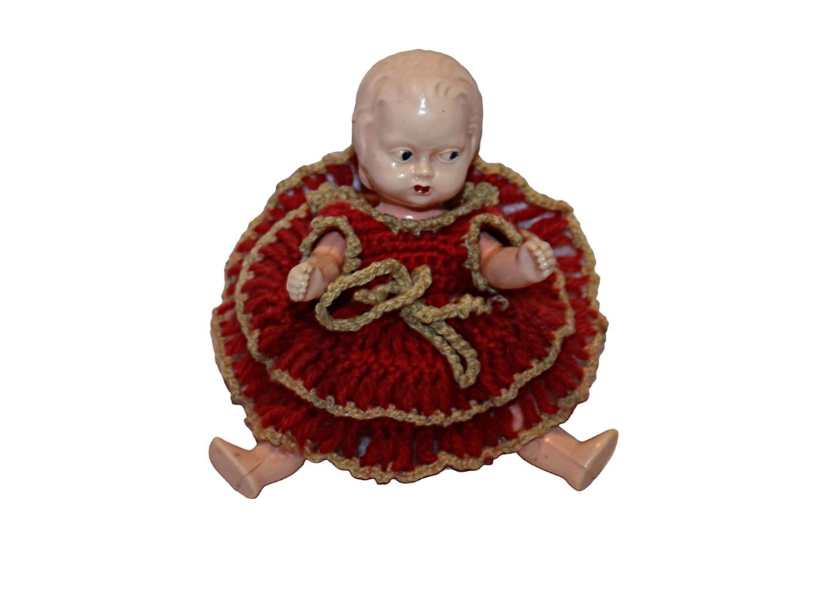 Lítil dúkka í hekluðum rauðum kjól.