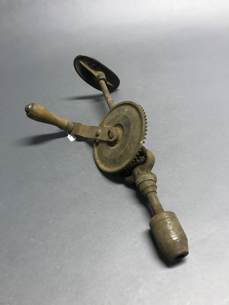 Handbor úr málmi með tréskafti á sveifinni. Alveg heill.