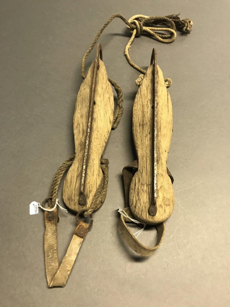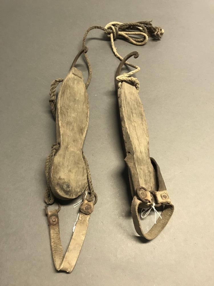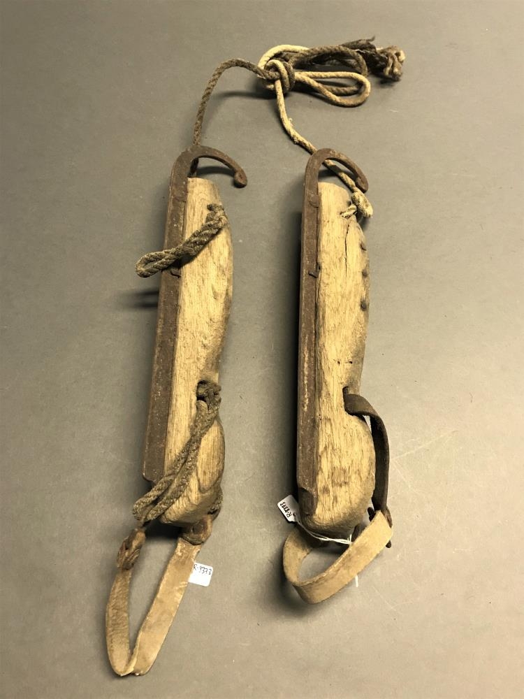 Par af heilum tréskautum með járnmeiðum, festingar vantar að hluta. Skautatréð er aðeins íhvolft að ofan og kjalarlaga að neðan. Neðst á kilinum er gróp sem járnmeiðarnir ganga upp í og þeir festir með nöglum sem ná í gegnum skautatréð: Við hælstykkið er á meiðunum flöt lykkja sem neglt er í gegnum með járnnagla sem nær í gegnum skautatréð, um miðjuna eru einfaldir járnpinnar sitthvoru megin meiðsins sem styðja við járnið. Við tánna eru lykkjur upp á rönd sem liggja við meiðinn en lykkjuleggurinn er rekinn í gegnum skautatréð. Í gegnum lykkjurnar og meiðinn er hnoðaður nagli.