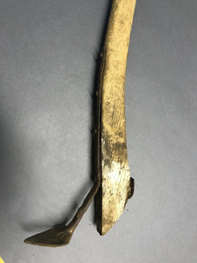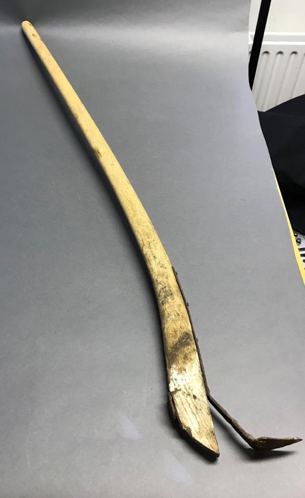 Langt tréskaft af óþekktu áhaldi, e.t.v. skóflu. Skaftið heilt, það sveigist neðst. Efst er það sívalningur en breikkar og verður þykkara og flatara í þversniði neðst. Þar er fest járnband úr einu stykki með sex hnoðuðum járnnöglum og spaða neðst með þremur nöglum sem legið flatur t.d. á skóflublaði.