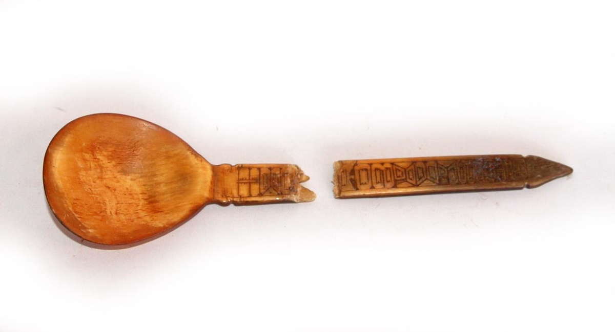 Spónn úr kýrhorni, 17,7 cm að lengd, skeið/blað 5,3 cm að breidd. Brotinn í tvennt, mjög jagaður og flagnaður. Á haldi er höfðaletur, þar stendur: H (?), u, ?, t (?), i ,n, g, u, ð, m, i, n, n.
