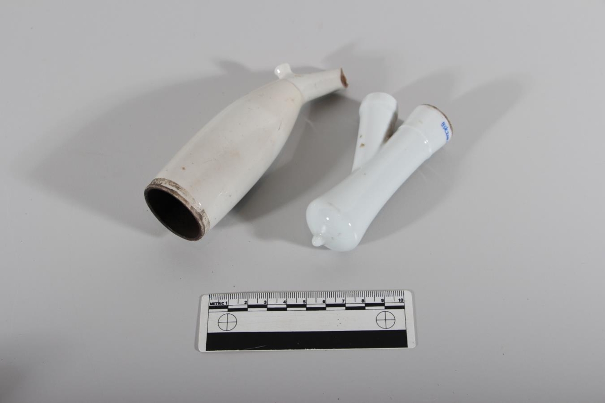Pípuhaus úr hvítu postulíni, tvískipt. Hausinn er lúðurlaga, lengd hans er 14,7 cm. Þvermál efst 3,9 cm. Stungið ofan í haldstykkið sem opnast í tvo stúta, annan fyrir haus, 2,2, cm víður og hinn fyrir munnstykki og er 2,6 cm víður. Lengd haldstykkis er 10,7 cm en alls með haus er það 22,7 cm. Munnstykkið vantar.