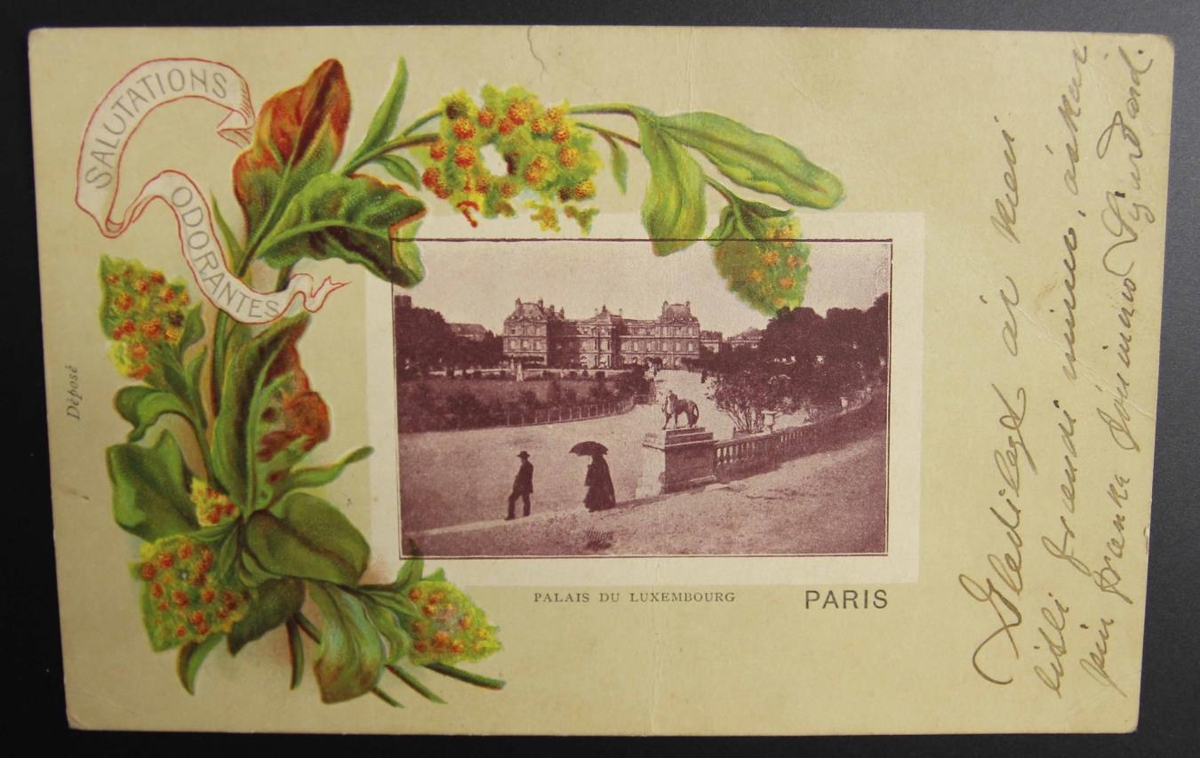 Nýárskort, einfalt, ljóst kort með mynd af Palais du Luxembourg. Útgefið í París. Um myndina vefst frá vinstri grænn blómvöndur með borða sem á stendur SALUTATIONS ODORANTES. Það er til: „Ingismaður Charl Kornaðsson Skarðsá“. Á því stendur: Gleðilegt ár kæri litli frændi minn, óskar þín frænka Jóninna Sigurðard. Það er Jóninna Sigurðardóttir (f. 1885) frá Litlu-Seylu (Brautarholti). Hún var Rjómabústýra við Rjómabúið við Staðará 1907 og fór (sennilega) 1908 til Kaupmannahafnar og giftist þar. Kortið er frá 1908-1910. Gefandi er Ingibjörg Sigurðardóttir frá Varmalandi.