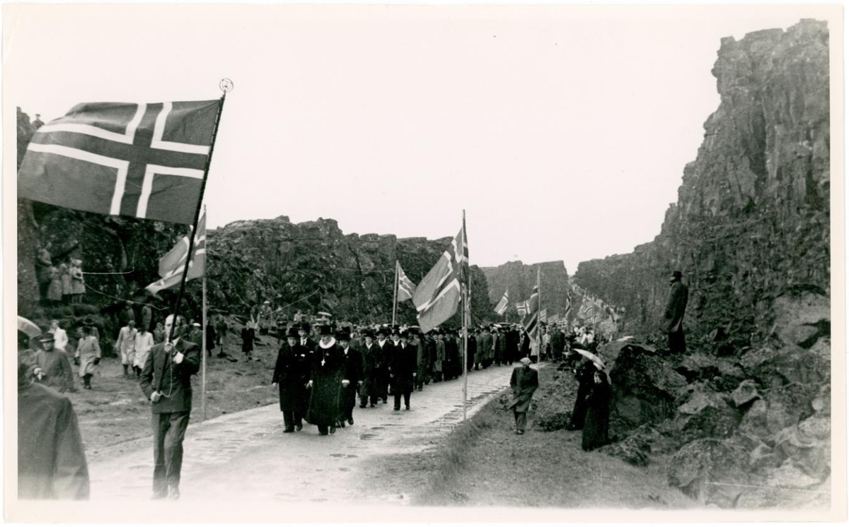 Skrúðganga Alþingismanna og annarra fyrirmenna þjóðarinnar á leið frá Hakinu og norður eftir Almannagjá. Fremst fer fánaberi með Íslenska fánann á lofti og meðfram götunni standa fanastangir með þjóðfánanum.