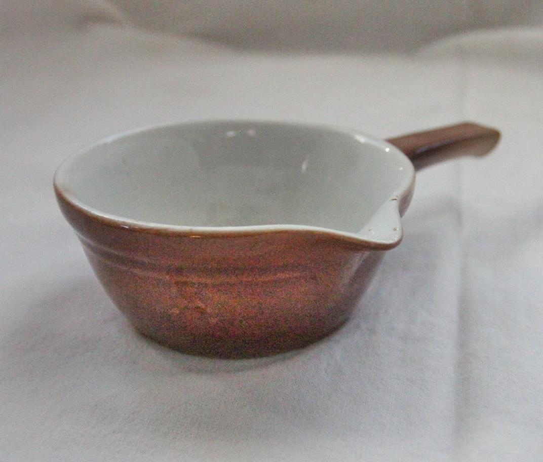Sósukanna úr leir, hvítglerjuð að innan en dökkbrúnglerjuð að utan. Skálin er 9,6 cm í þvermál. Hæð 4,5 cm. Haldið er 5,8 cm að lengd, stuttur stútur - túða. Merkið á botninum er: ARABIA Made in England með undirskrauti.