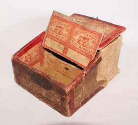Púlt undir smádót, búið til úr vindlakössum og eldspítustokkum. Stærð 15,5 x 12,5 x 6,2 sm, litur er brúnn - rauðbrúnn með einhvers konar veggfóðri. Með lás. Lokið er fóðrað með ,,Bryant og Mays Ruby Matches" og hliðar, en botn og skúffa með ,,Protection frome Fire. Trademark. Safety Match". Haganlega gert í upphafi en allt að losna og slitna.