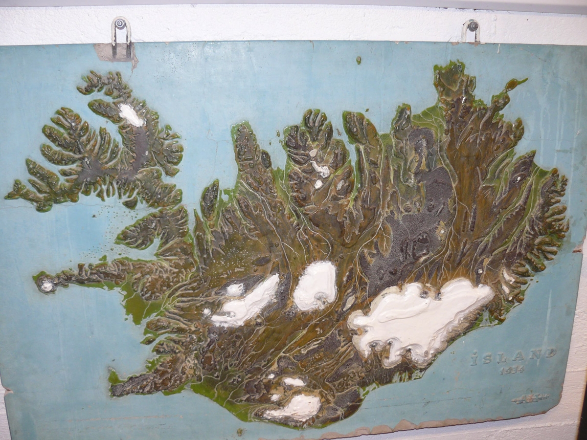 Íslandskort steypt, upphleypt frá árinu 1934. Þetta kort var í kennslustofu í Gerðaskóla í Garði. Líkanið var búið til af Axeli Helgasyni sem var módelsmiður í Reykjavík. Hann var fæddur 23.09.1909. Dó 13.04. 2001. Hann var módelsmiður í 47 ár. Heimildir frá Ólafi Axlssyni í Kópavogi.