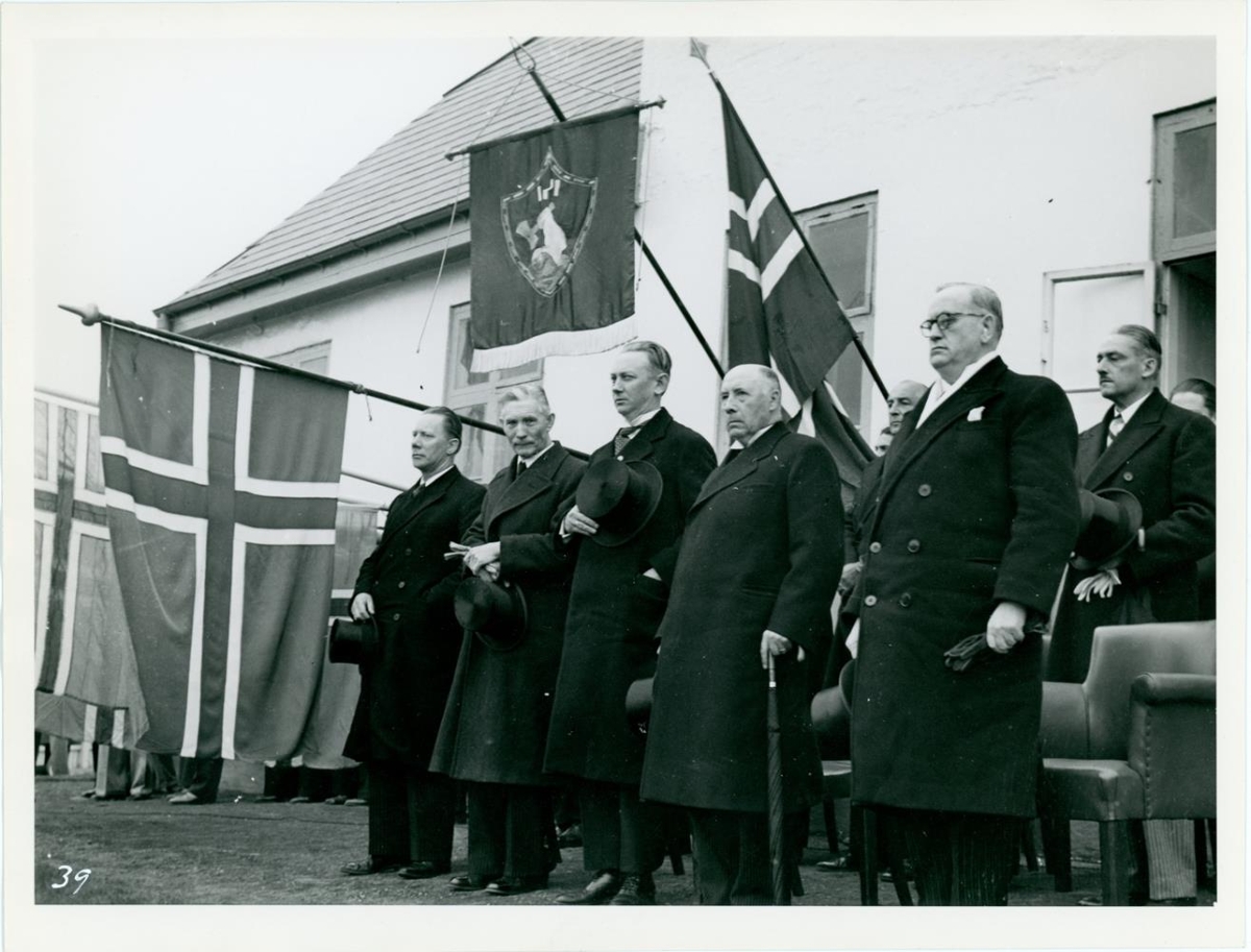 Reykjavík, 18. júní 1944. Forseti Íslands, herra Sveinn Björnsson og ríkisstjórnin: dr. Björn Þórðarson forsætisráðherra, Vilhjálmur Þór utanríkis- og atvinnumálaráðherra, dr. Einar Arnórsson dómsmálaráðherra, Björn Ólafsson fjármálaráðherra, við stjórnarráðshúsið.